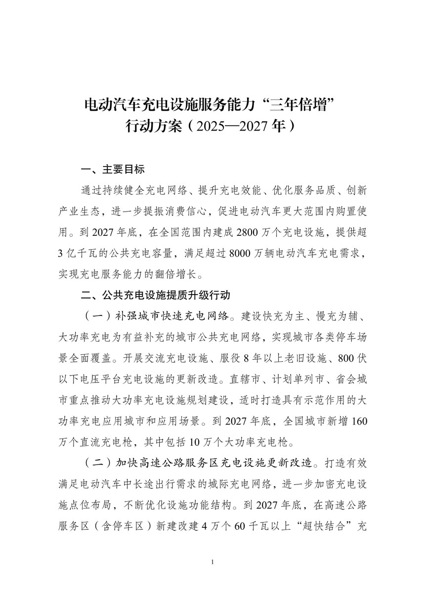 發(fā)改能源〔2025〕1250號(hào) 各省、自治區(qū)、直轄市、新疆生產(chǎn)建設(shè)兵團(tuán)發(fā)展改革委、能源局、工業(yè)和信息化主管部門、住房城鄉(xiāng)建設(shè)主管部門、交通運(yùn)輸主管部門、市場(chǎng)監(jiān)管部門,北京市城市管理委員會(huì),國家電網(wǎng)有限公司、中國南方電網(wǎng)有限責(zé)任公司、內(nèi)蒙古電力(集團(tuán))有限責(zé)任公司,中國電力企業(yè)聯(lián)合會(huì): 為落實(shí)《提振消費(fèi)專項(xiàng)行動(dòng)方案》有關(guān)要求,加大力度完善電動(dòng)汽車充電設(shè)施服務(wù)網(wǎng)絡(luò),提升消費(fèi)品質(zhì),促進(jìn)電動(dòng)汽車更大范圍內(nèi)購置使用,國家發(fā)展改革委等部門研究制定了《電動(dòng)汽車充電設(shè)施服務(wù)能力“三年倍增”行動(dòng)方案(2025—2027年)》,現(xiàn)印發(fā)給你們,請(qǐng)認(rèn)真組織落實(shí)。 國家發(fā)展改革委 國 家 能 源 局 工業(yè)和信息化部 住房城鄉(xiāng)建設(shè)部 交 通 運(yùn) 輸 部 市場(chǎng)監(jiān)管總局 2025年9月24日 |